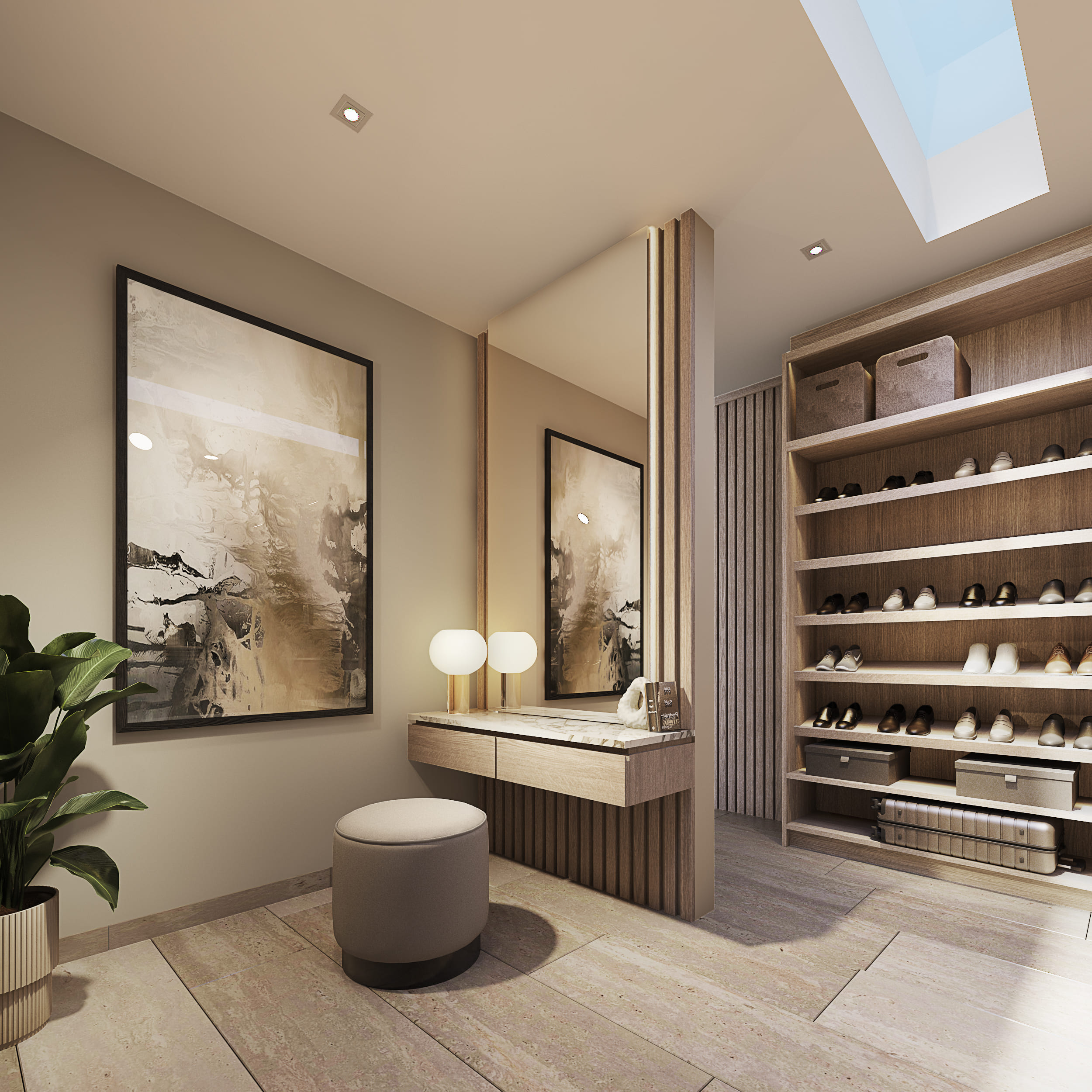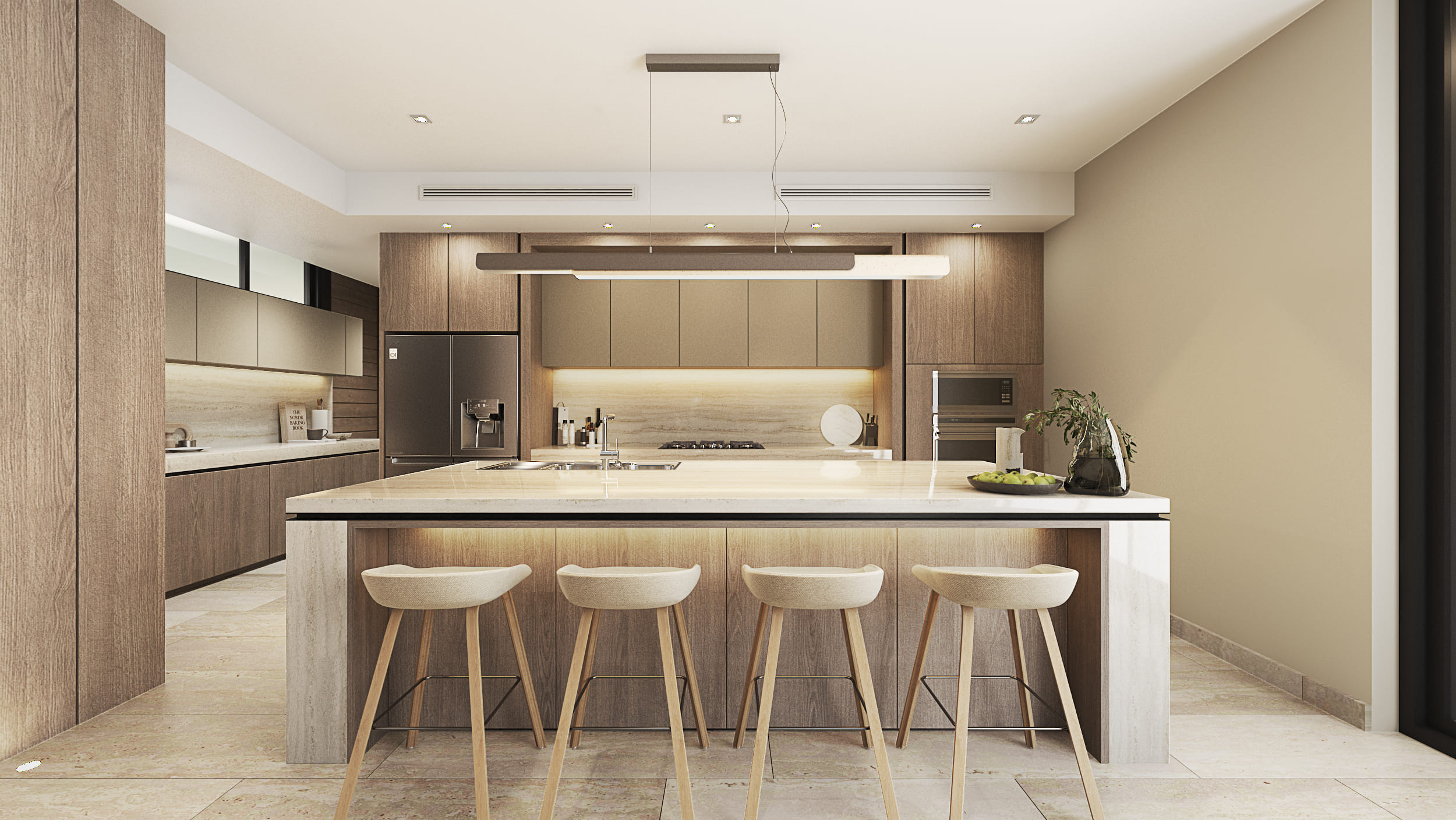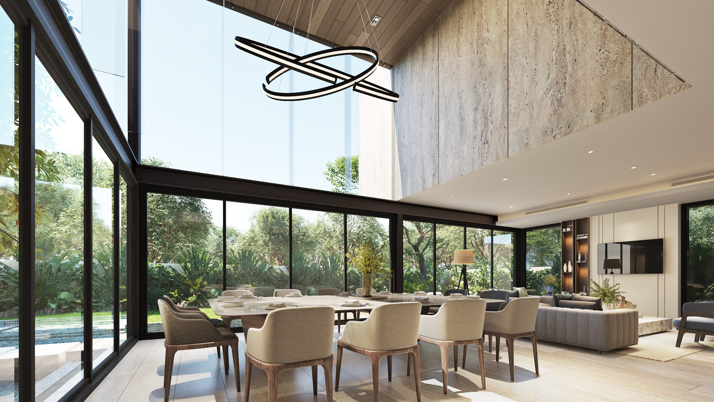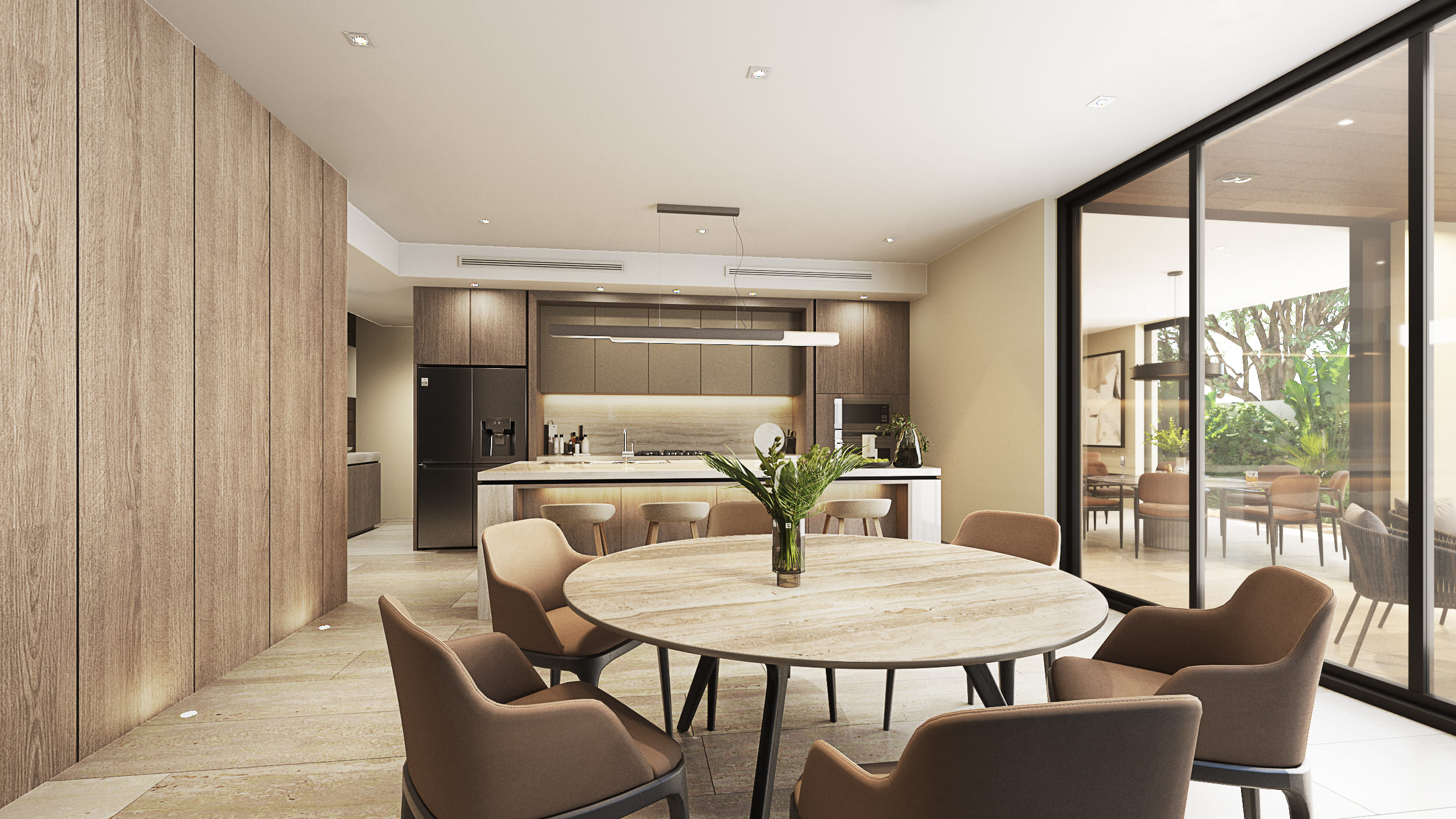 The façade reflects these design intentions by being developed in a way that, despite the required height, the proportions maintain a private residential feel, using materials that integrate cohesively with each other. Regarding the general layout: the first level includes social areas and service spaces; the second level houses secondary private areas; and the third level contains the main private areas. Thanks to the vertical layout, all major spaces benefit from excellent exterior views without compromising comfort and privacy.