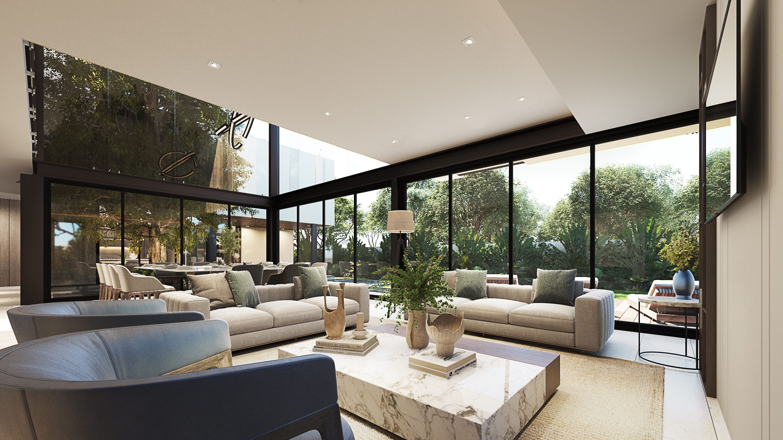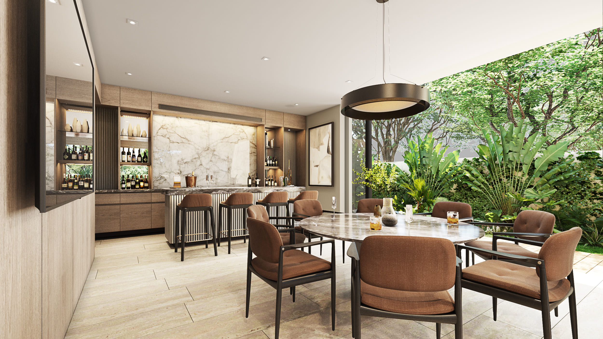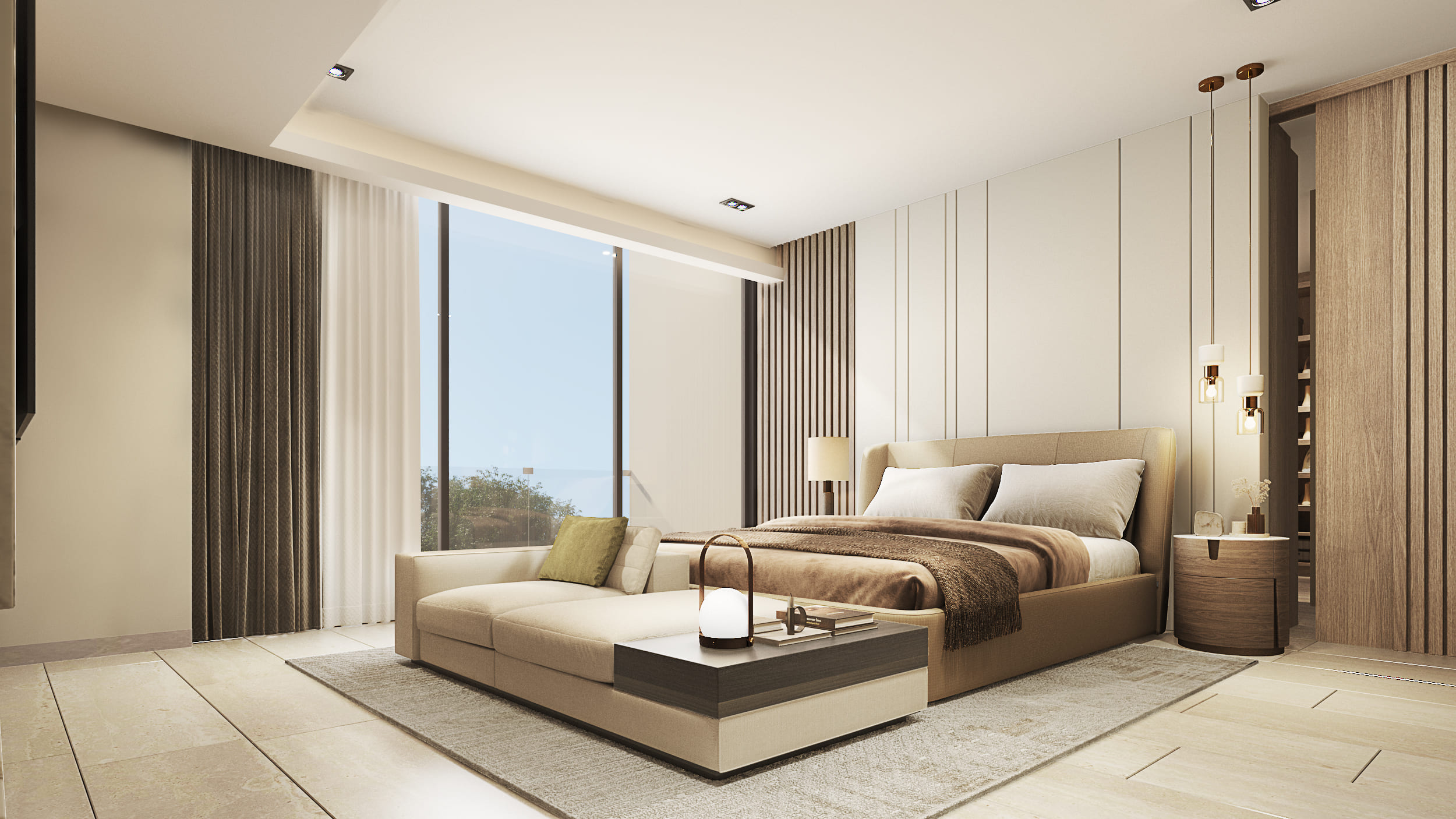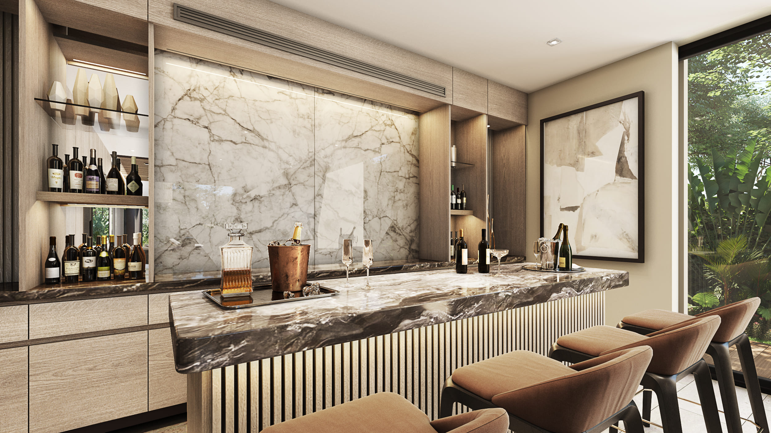 The façade reflects these design intentions by being developed in a way that, despite the required height, the proportions maintain a private residential feel, using materials that integrate cohesively with each other. Regarding the general layout: the first level includes social areas and service spaces; the second level houses secondary private areas; and the third level contains the main private areas. Thanks to the vertical layout, all major spaces benefit from excellent exterior views without compromising comfort and privacy.