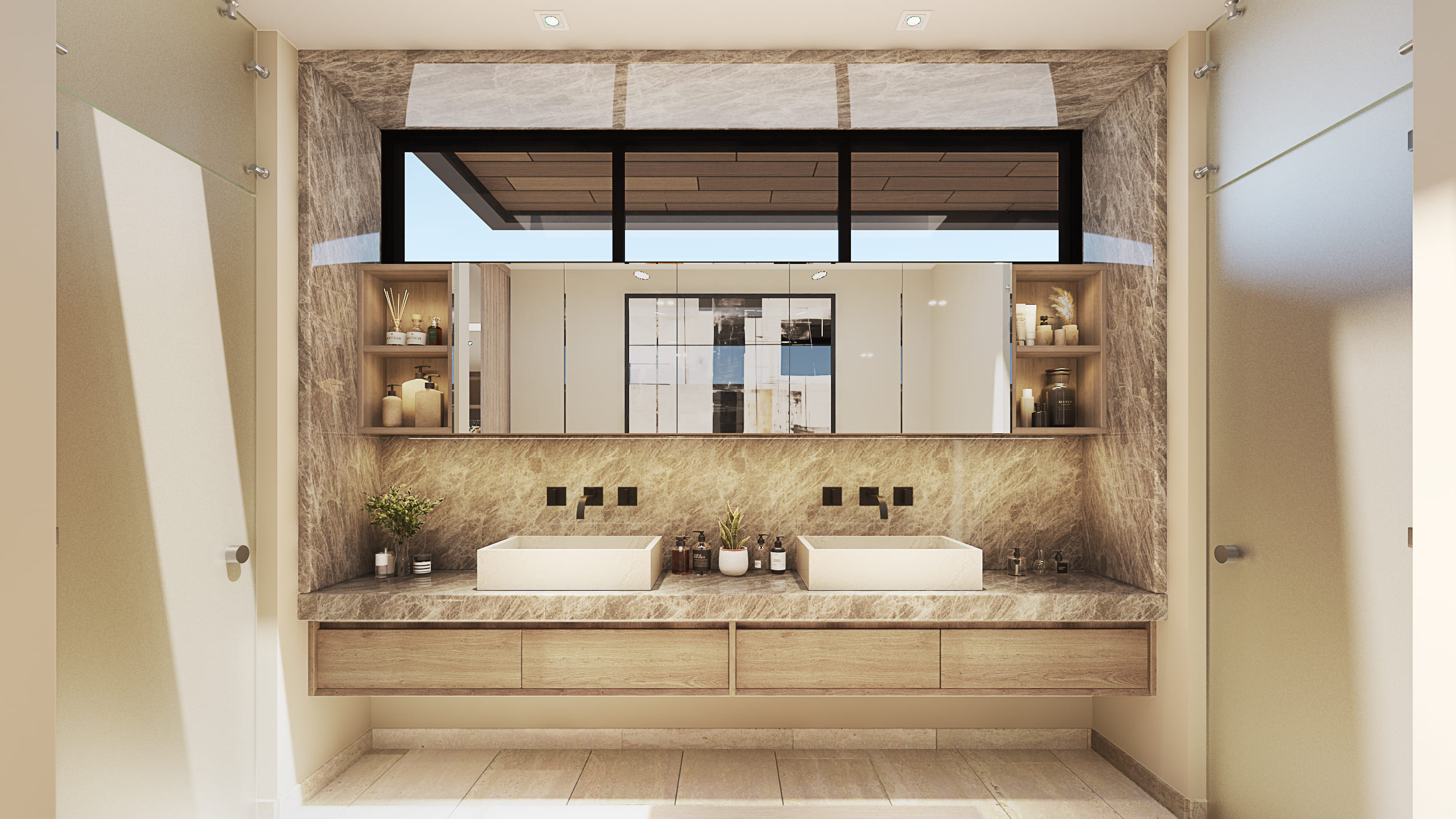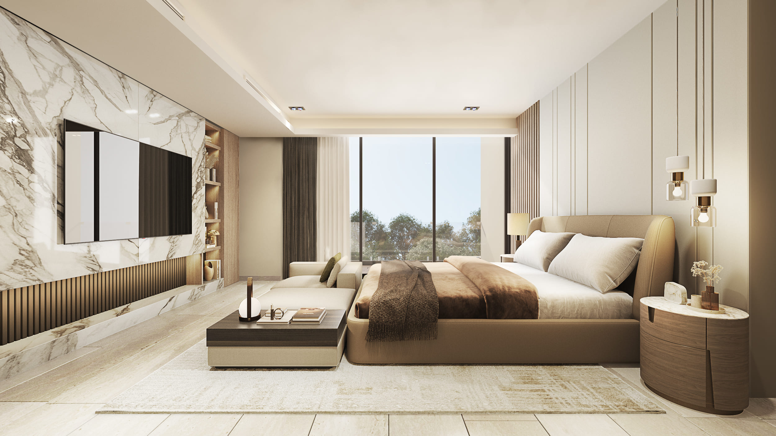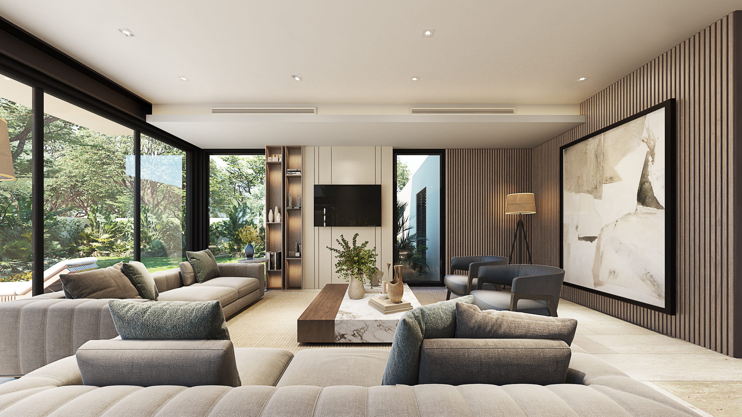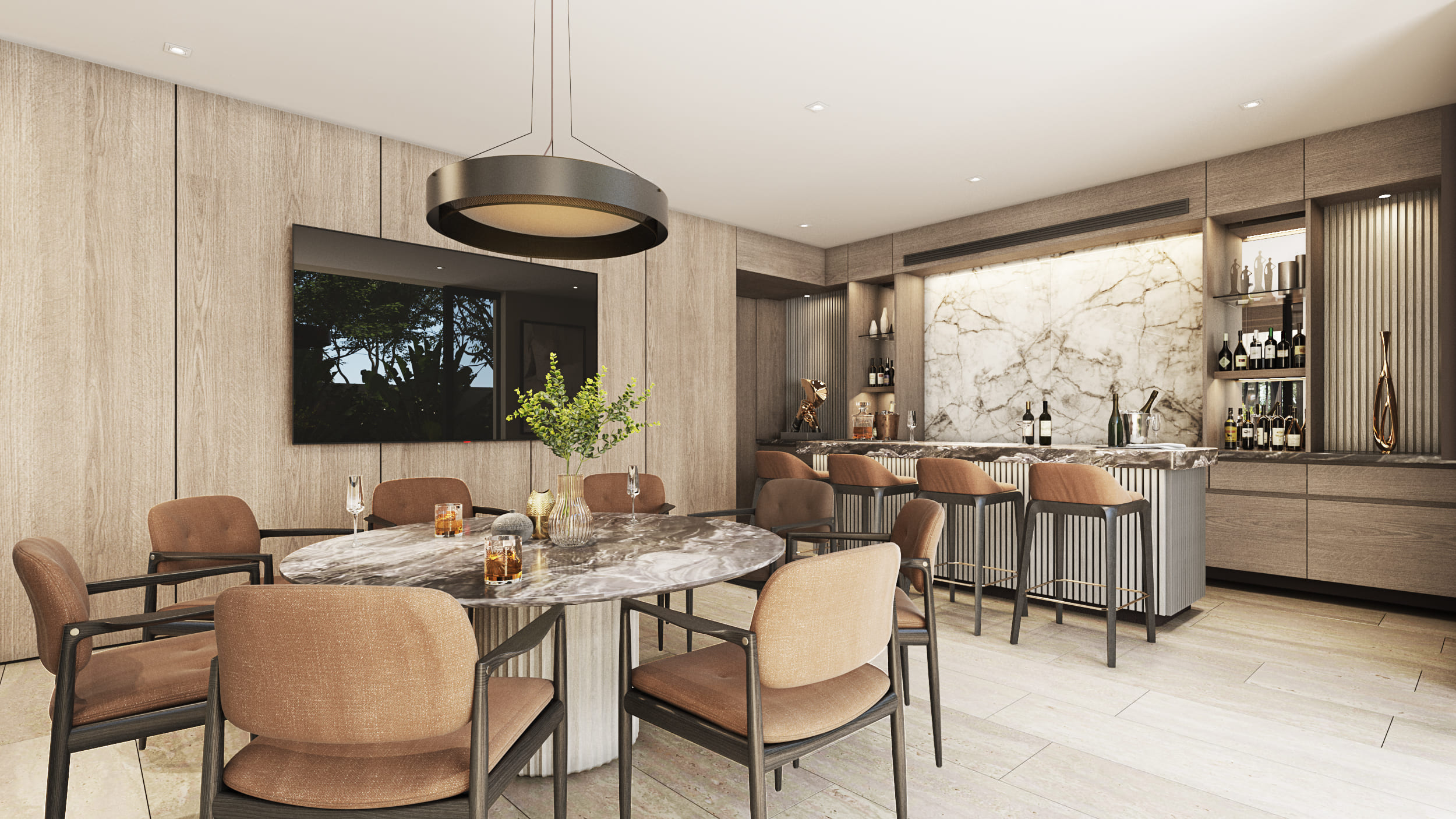 The façade reflects these design intentions by being developed in a way that, despite the required height, the proportions maintain a private residential feel, using materials that integrate cohesively with each other. Regarding the general layout: the first level includes social areas and service spaces; the second level houses secondary private areas; and the third level contains the main private areas. Thanks to the vertical layout, all major spaces benefit from excellent exterior views without compromising comfort and privacy.